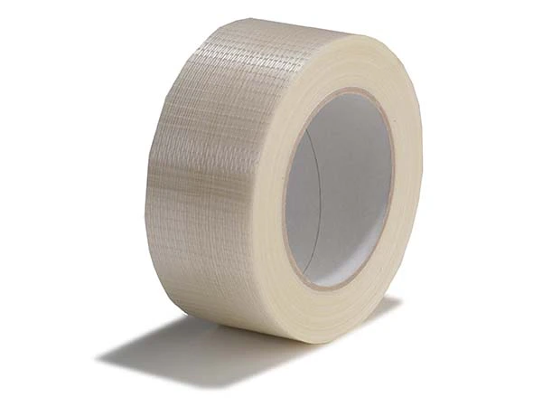 Transparentes Band mit BOPP-Träger, Glasgewebe und synthetischem Kautschukkleber zum Verschließen von schweren Kartons.